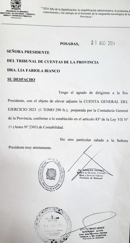 El Ministro de Hacienda de la provincia de Misiones, Adolfo Safrán, dijo, "días atrás desde el Ministerio de Hacienda elevamos al Tribunal de Cuentas de Misiones, presidido por la Dra. Lía Fabiola Bianco, la Cuenta General del Ejercicio financiero de la Provincia correspondiente al año 2023".