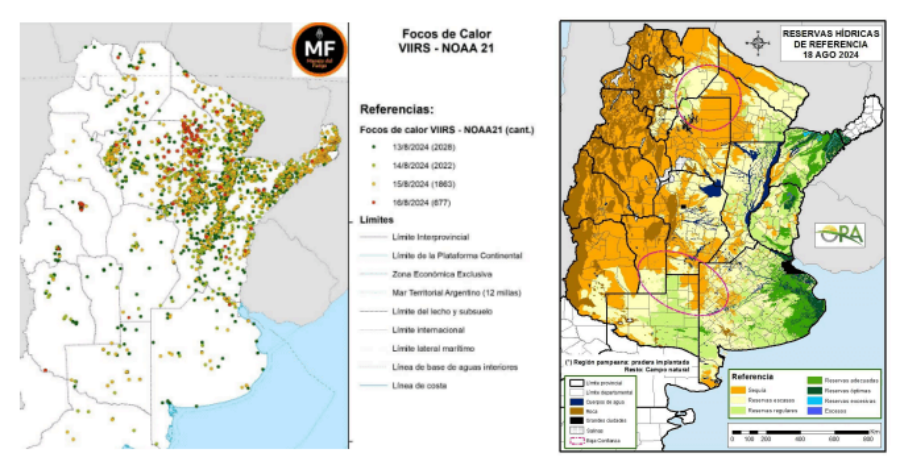 Si esto se relaciona con el mapa de estado de reservas hídricas para pastura o campo natural que estima la ORA, la luz de alarma se hace más fuerte: se puede apreciar que se están evidenciando gran cantidad de focos de calor en áreas en que se estima déficit hídrico, como por ejemplo el oeste de Chaco.