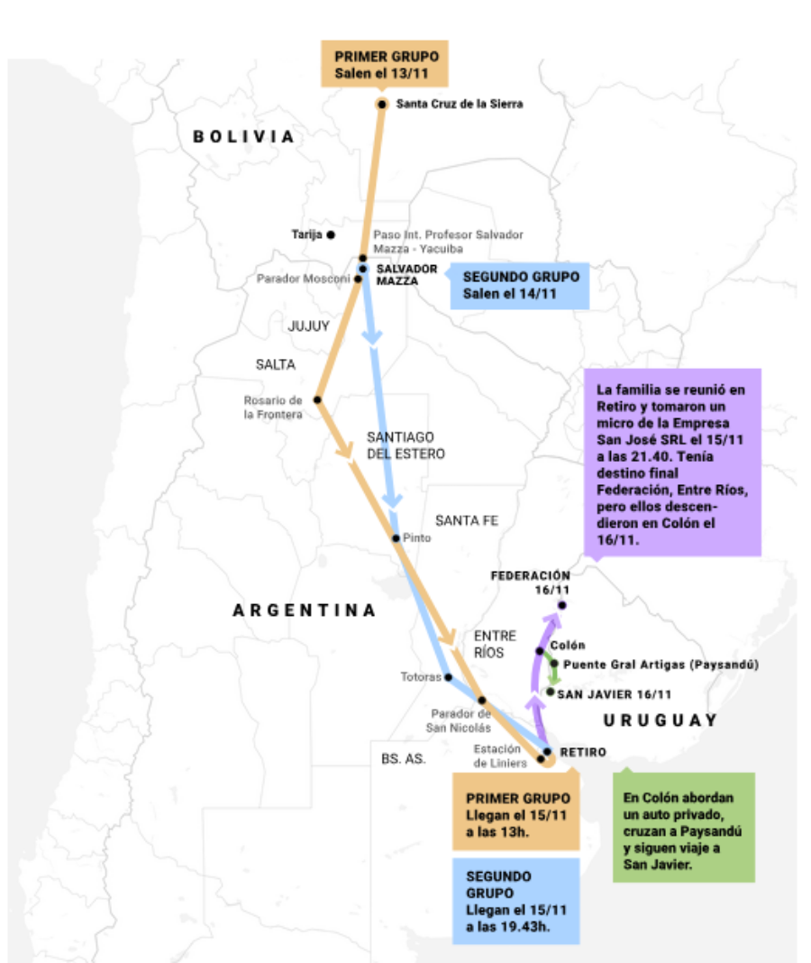 El primer grupo lo hizo en un ómnibus de la empresa Autobuses Quirquincho SRL que partió de Santa Cruz de la Sierra, Bolivia, el 13/11, con destino a la Terminal de Ómnibus de Retiro, en la ciudad de Buenos Aires. En el camino, ya al día siguiente, se detuvieron tres veces, donde la familia pudo haber tenido contacto también con lugareños del Parador Mosconi (Salta), donde los pasajeros podían almorzar, en el Parador Rosario de la Frontera (Santiago del Estero), donde pararon para cenar ese día. A la mañana siguiente, ya el sábado 15, el ómnibus hizo la última escala en el Parador San Nicolás (Buenos Aires) durante la mañana y antes de llegar, a las 12.30, a la terminal ubicada en el barrio porteño de Liniers.