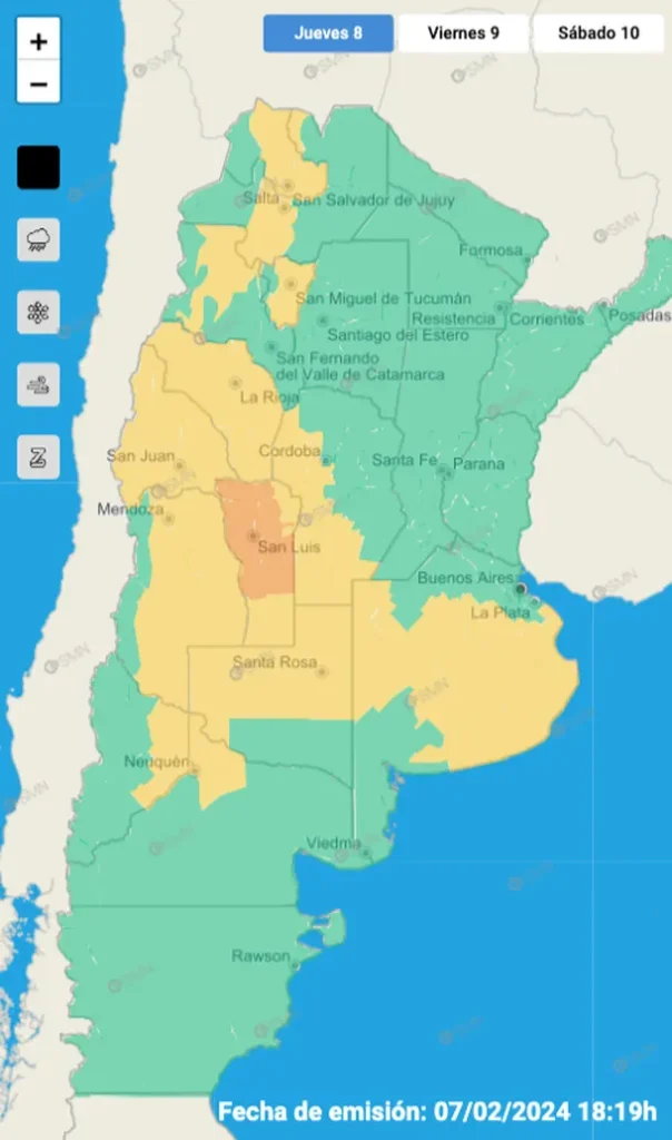 Se trata de un alerta amarillo para zonas de la provincia de Buenos Aires, La Pampa, Río Negro, Neuquén, San Luis, Córdoba, Mendoza, San Juan, La Rioja, Catamarca, Tucumán, Salta y Jujuy. En regiones de San Luis, el aviso sube a alerta naranja.