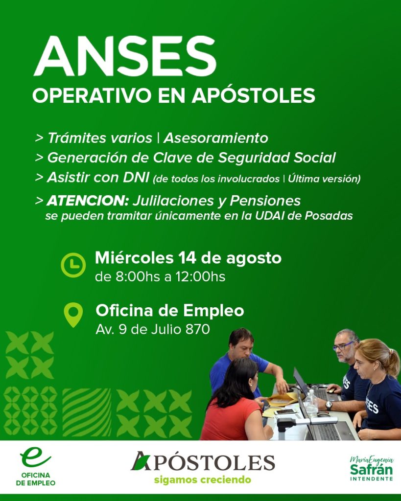 La Administración Nacional de la Seguridad Social (ANSES) realizará un operativo de atención al público en la ciudad misionera de Apóstoles el próximo miércoles 14 de Agosto. El operativo se llevará a cabo en la Oficina de Empleo, de 8,00 a 12,00 horas.