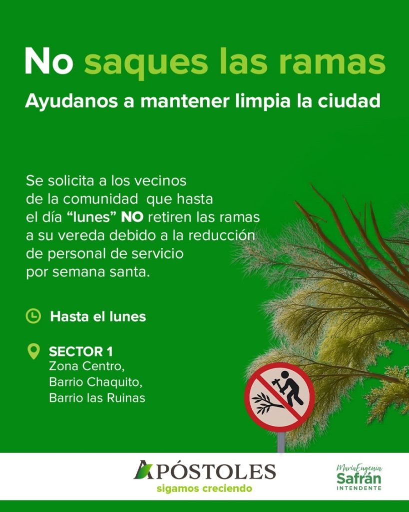 Apóstoles: Solicitan colaborar con la poda autorizada, al no sacar ramas a la vereda durante Semana Santa