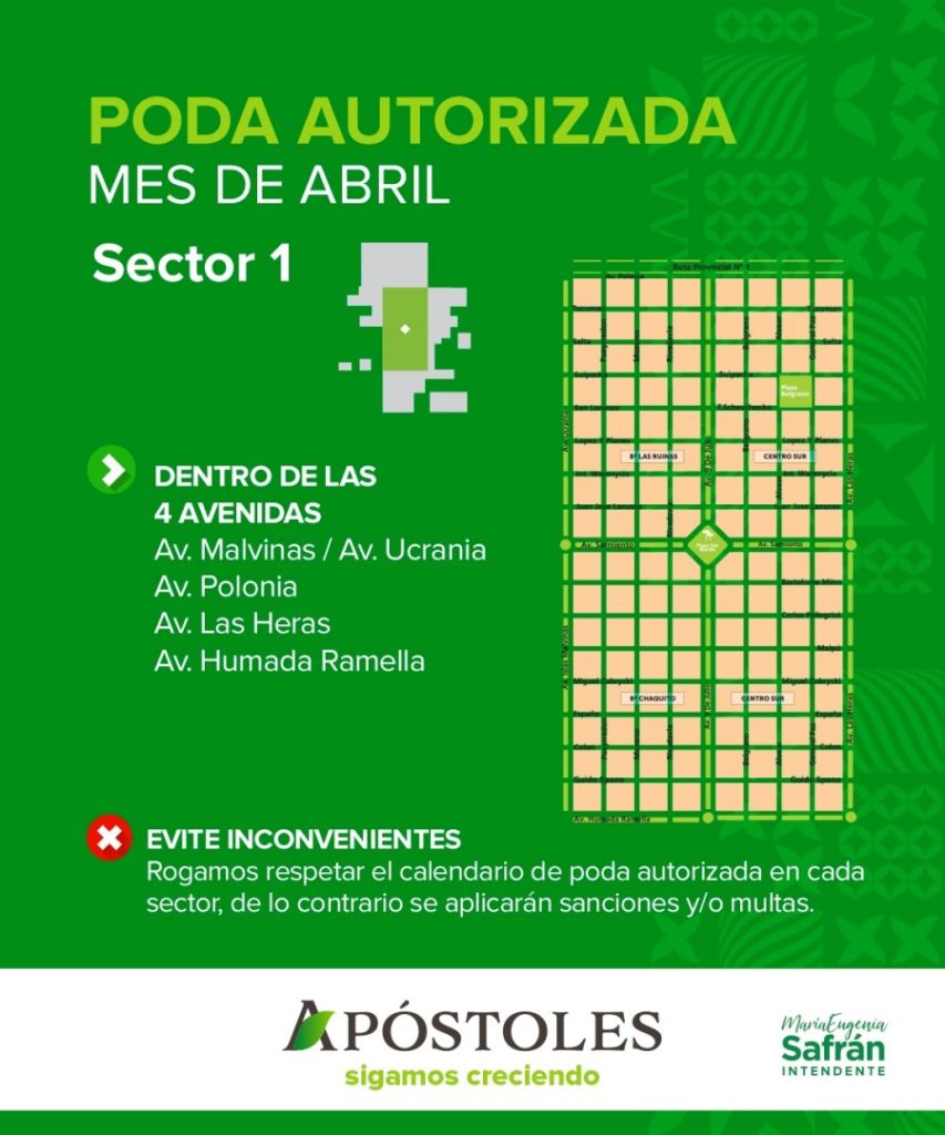 La Municipalidad del Municipio misionero de Apóstoles, a través de la Dirección de Ambiente, informa que a partir del mes de Abril se llevará a cabo la recolección de la poda autorizada en la vía pública de árboles del Sector I.