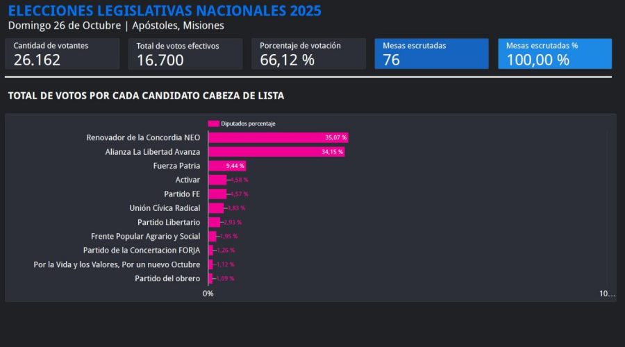 Con estos guarismos totales provisorios, da ganador al Frente Renovador Neo que tenía como cabeza de Lista al Presidente de la Cámara de Representantes de la provincia de Misiones, Dr. Oscar Herrera Ahuad, quien junto los demás Candidatos lograron 5.856 votos el 35,07% y el segundo más votados fue el ex tenista de la ciudad de Oberá, Diego Hartfield con 5.703 sufragios.