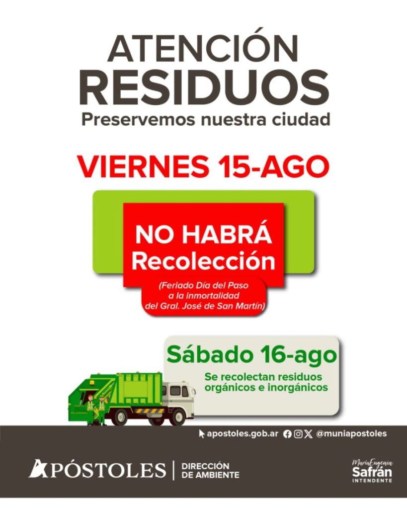 Apóstoles: Cronograma de Recolección de Residuos Domiciliarios por el Feriado del 17 de Agosto, el día viernes no habrá servicio