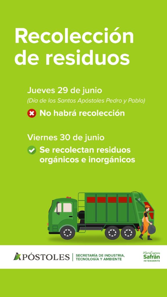 La Municipalidad de Apóstoles la ciudad misionera de Apóstoles a través de la Secretaría de Industria, Tecnología y Medio Ambiente informa a la comunidad que el día jueves 29 de Junio, no habrá recolección de residuos domiciliarios por conmemorarse el Día de los Santos Apóstoles; Pedro y Pablo - Patrono de la ciudad -.