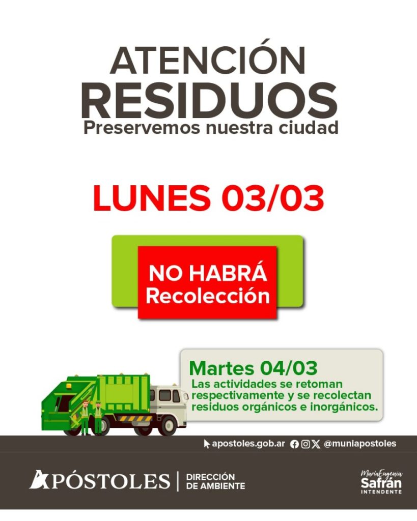 Apóstoles: El día lunes 3 de Marzo, no habrá recolección de residuos domiciliarios debido al feriado por Carnaval
