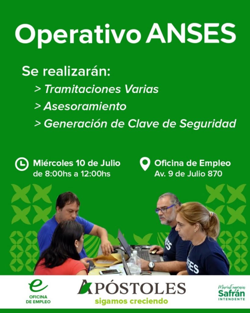 La Oficina de Empleo de la Municipalidad de la ciudad misionera de Apóstoles informa a toda la comunidad que el día miércoles 10 de Julio habrá un importante operativo de ANSES en el Municipio en el horario de 8,00 a 12,00 horas.