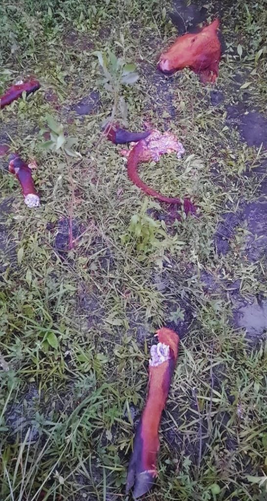 Personal de la citada dependencia se abocó a las pesquisas del ilícito, hallando primeramente en inmediaciones del lugar, los restos del animal, como ser cabeza, extremidades y vísceras.