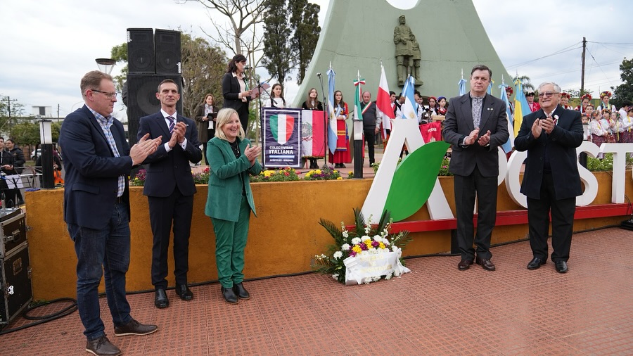 La Intendente María Eugenia Safrán, junto a su Gabinete Municipal, Ediles, representantes de las Colectividades; Polaca, Ucraniana e Italiana, fuerzas de seguridad y la comunidad en general, se reunieron en el emblemático monumento de la Llegada de los Primeros Inmigrantes para rendir tributo a los pioneros que llegaron con sueños y esperanzas.