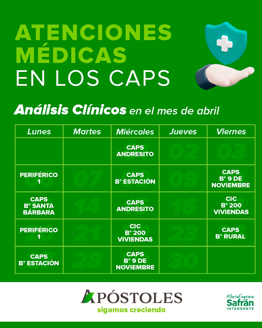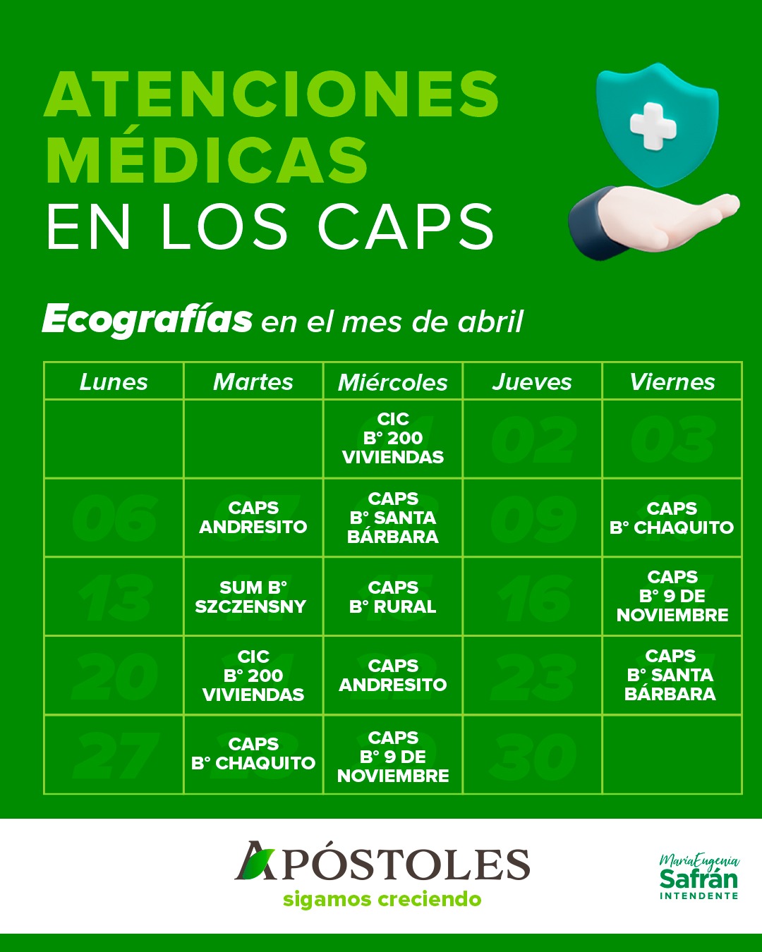 La Secretaría de Desarrollo Social de la Municipalidad del Municipio misionero de Apóstoles informa que durante todo el mes de Abril los Centros de Atención Primaria en Salud (CAPS) brindan servicios de análisis clínicos y ecografías en distintos barrios.