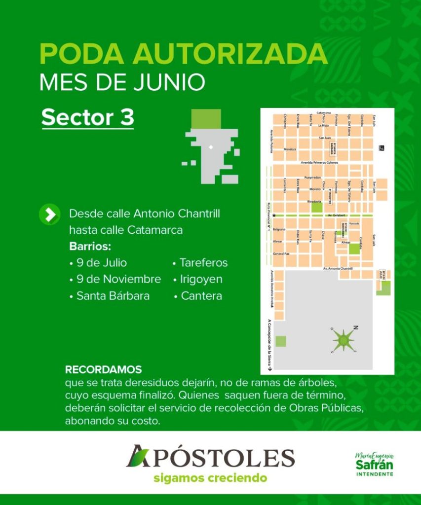 La Dirección de Medio Ambiente del Municipio misionero de Apóstoles informa que en este mes de Junio se realizarán podas autorizadas en el Sector III. Este sector comprende desde la Avenida Chantrill hasta la calle Catamarca, abarcando los barrios: