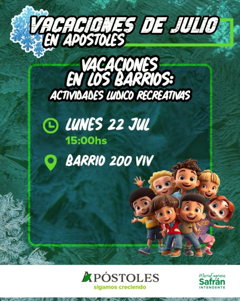 La Municipalidad de la ciudad misionera de Apóstoles invita a todos los vecinos, especialmente a los niños, del Barrio Néstor C. Kirchner - ex 200 Viviendas - del Municipio a participar de las actividades lúdico recreativas en estas Vacaciones de Invierno 2024, las mismas tendrán lugar este día lunes 22 de julio del corriente a partir de las 15,00 horas.