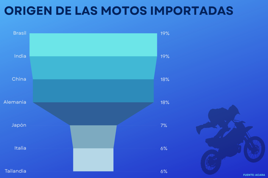 En cuanto a la distribución geográfica, la provincia de Buenos Aires concentra la mayor cantidad de patentamientos con 13.308 unidades, seguida por Santa Fe (4.346), Córdoba (3.748), Tucumán (2.177) y Chaco (2.124). Respecto al origen de los motovehículos importados, Brasil e India lideran con el 19% cada uno, seguidos por China y Alemania, ambos con un 18%, y Japón con un 7%.