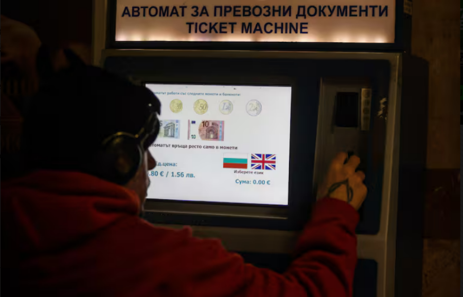 Una persona compra billetes en una máquina que indica qué billetes y monedas de euro se aceptan, en Sofía, el jueves 1° de Enero de 2026 - Valentina Petrova - AP