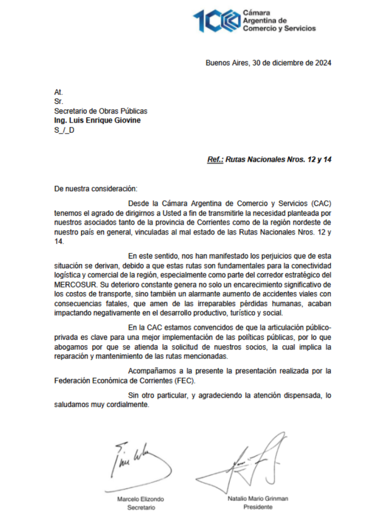 Desde la Cámara Argentina de Comercio y Servicios (CAC) tenemos el agrado de dirigirnos a Usted a fin de transmitirle la necesidad planteada por nuestros asociados tanto de la provincia de Corrientes como de la región nordeste de nuestro país en general, vinculadas al mal estado de las Rutas Nacionales Nros. 12 y 14.