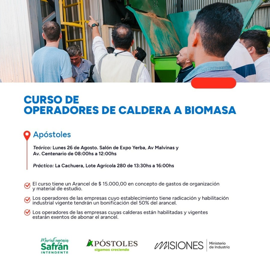 El Ministerio de Industria de la provincia de Misiones y la Secretaría de Desarrollo Económico, Industria y Tecnología de la Municipalidad del Municipio de Apóstoles anuncian la realización de una capacitación en Operaciones de Calderas a Biomasa, dirigida a todos los interesados en adquirir habilidades claves en el manejo de calderas y aumentar sus oportunidades laborales en el sector de energías renovables.