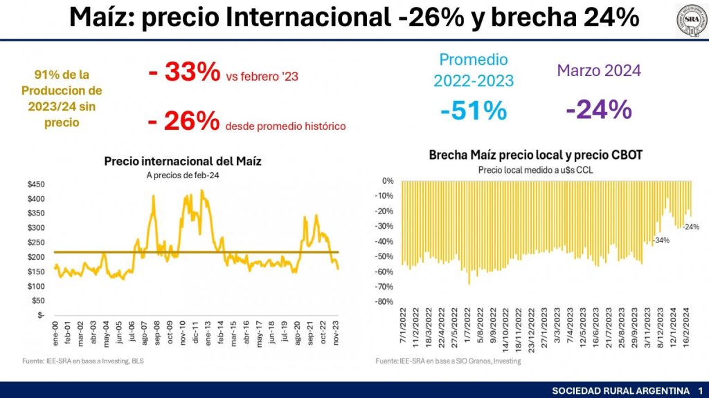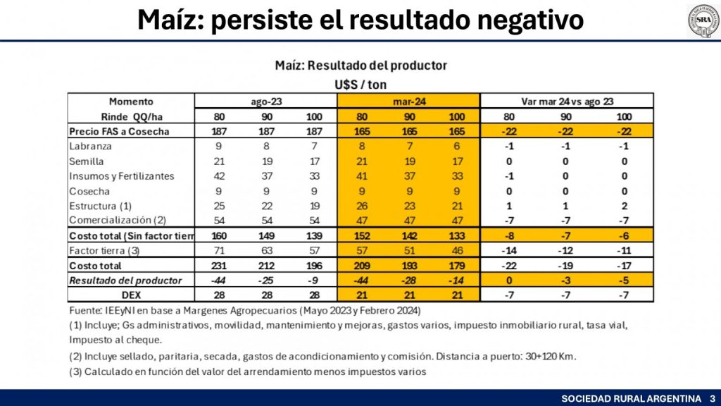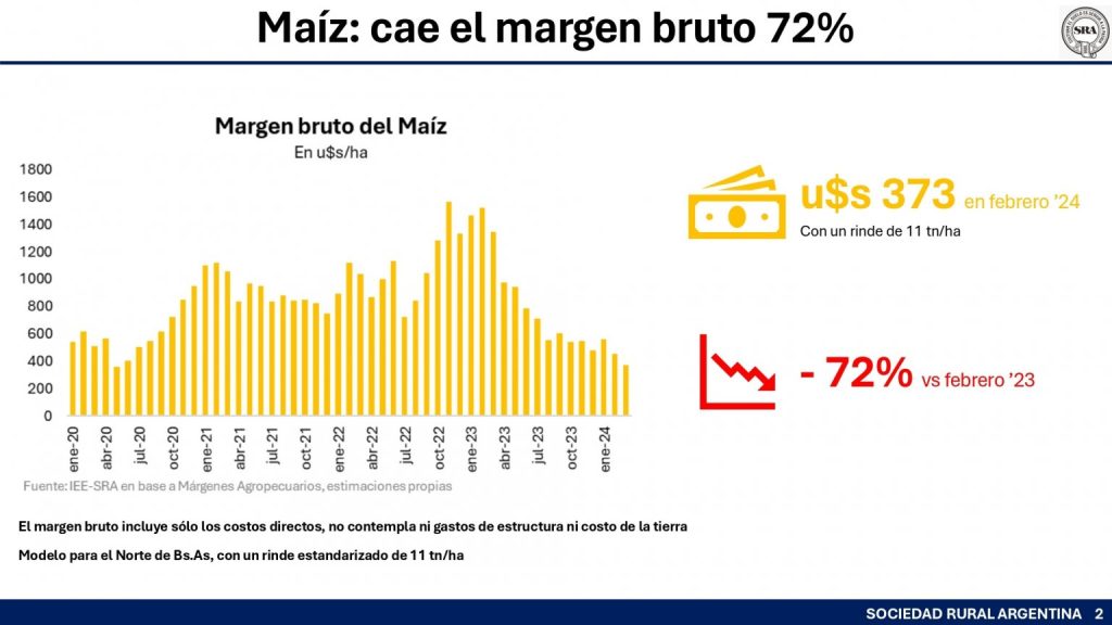 Al respecto, la SRA exhibió una serie de cuadros que muestran el deterioro de la ecuación económica del maíz, como el derrumbe del margen bruto y que, hoy, el resultado para el productor es negativo.