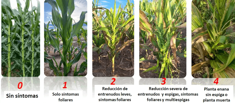 “La infección por Spiroplasma kunkelii puede provocar síntomas como el enanismo del maíz, clorosis en los bordes de hojas jóvenes y manchas rojizas en las hojas adultas. Las flores masculinas generalmente quedan imposibilitadas de producir polen, dependiendo del momento en el que se produjo la infección. En cuanto a la floración femenina, las plantas pueden quedar completamente estériles y generar múltiples mazorcas sin granos cuajados”, explica el informe.