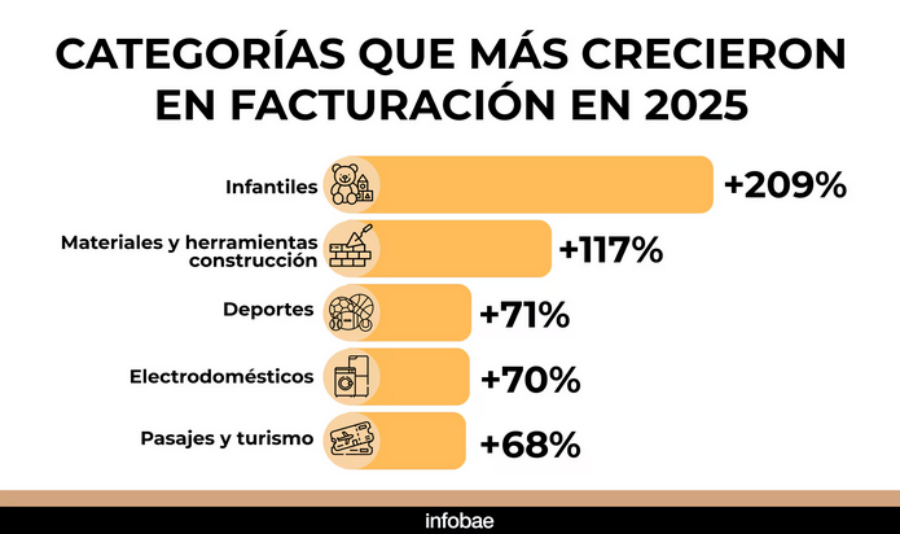 Al analizar las categorías con mayor peso en la facturación total de 2025, el ranking estuvo liderado por Pasajes y turismo, seguido por Alimentos, bebidas y artículos de limpieza; Equipos de audio, imagen, consolas, TI y telefonía; Artículos para el hogar; y Electrodomésticos de línea blanca y marrón. También tuvieron una participación relevante los rubros de Deportes, Cosmética y perfumería, productos Infantiles, Accesorios para motos y autos, y Materiales y herramientas de construcción.