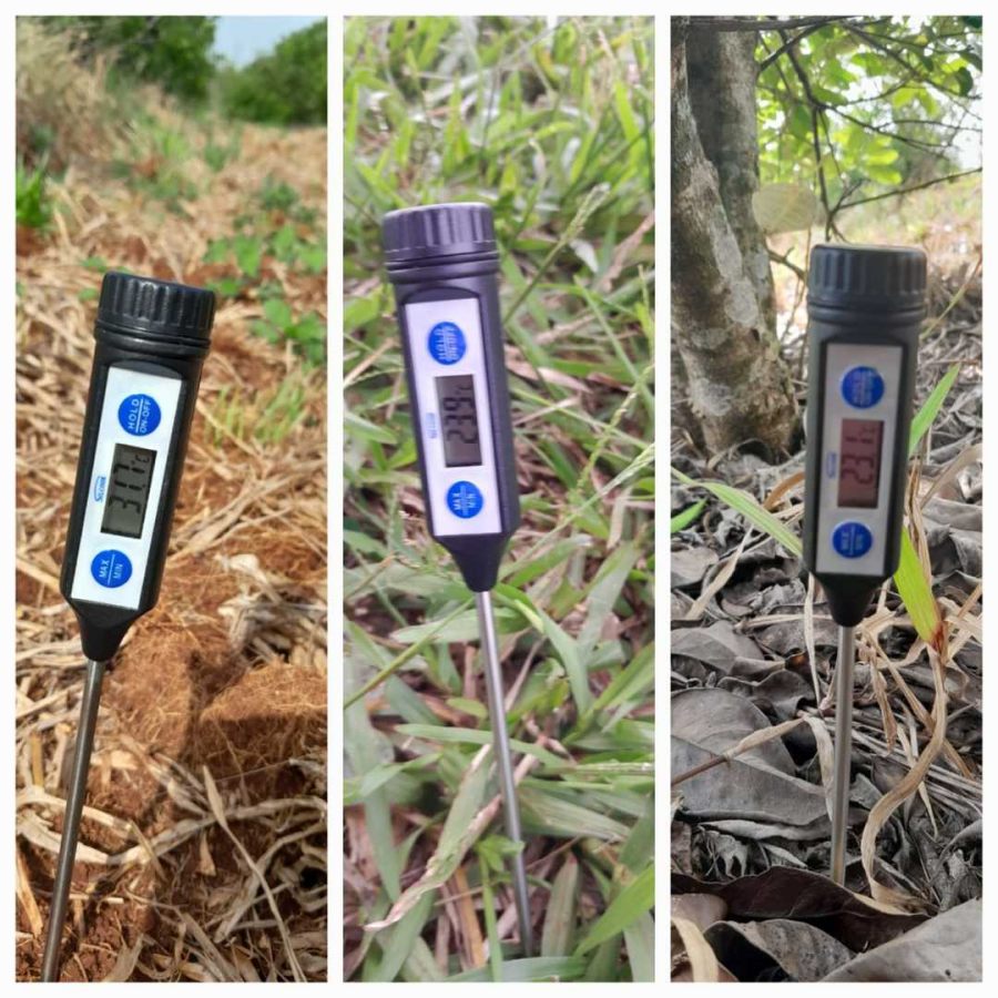 En suelo sin protección se evidenció 31.7 grados, en suelo con arvenses, 23.9 grados, y en suelo ubicado debajo de la planta, 23.1 grados.