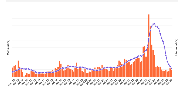 Los mejores datos vinieron este mes en el rubro alimentos y bebidas, con varias semanas en las que varias consultoras midieron deflación. Junto con la baja de la inflación, el otro dato favorable es que la economía retomó su ritmo de mejora, luego del tropezón de Marzo. Aunque todavía no están los datos oficiales del IMDEC, el Índice General de Actividad (IGA) que mide Orlando Ferreres y Asociados arrojó una mejora del 1,3% en Abril contra el mes anterior. La expansión del primer cuatrimestre es de 6,6% interanual, aunque comparando contra los peores meses post devaluación del 2024.