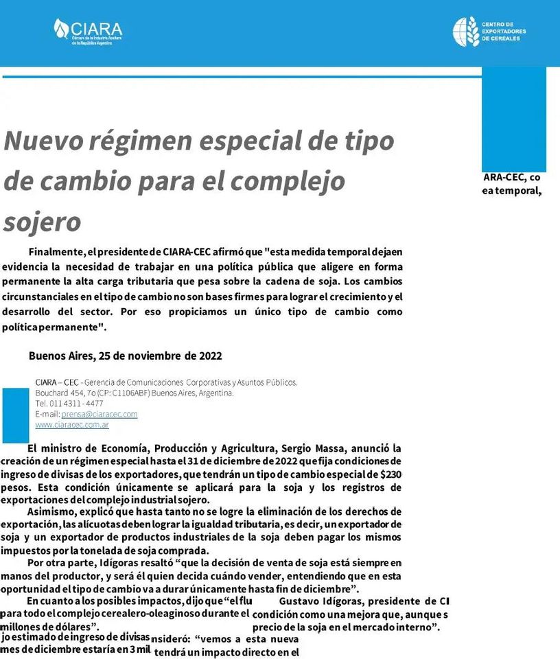 El Ministro de Economía, Sergio Massa, anunció la creación de un nuevo régimen especial para la venta de soja, que entrará en vigencia el lunes 28 de Noviembre y se extenderá hasta el 31 de Diciembre de 2022.
