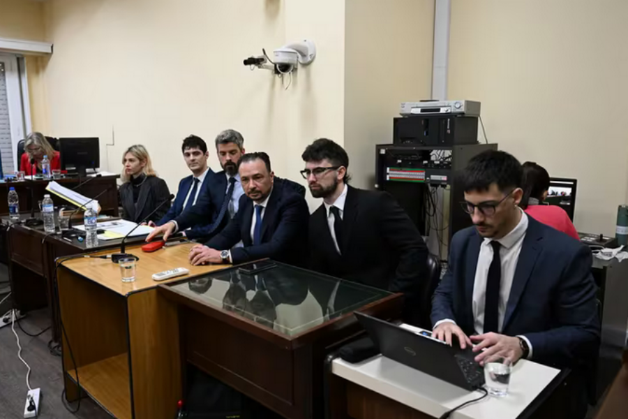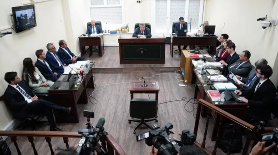 De izquierda a derecha: los querellantes Carolina Cymerman y Pablo Rovatti y el fiscal Sandro Abraldes, acusadores en el juicio oral contra el ex senador