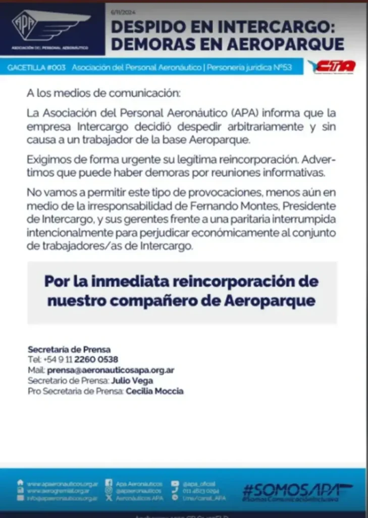 La decisión de la administración libertaria llega luego de la Asociación del Personal Aeronáutico (APA) llevará a cabo una sorpresiva jornada de asambleas informativas, para denunciar el "despido arbitrario" de un empleado de Intercargo. Además de las desvinculaciones, el Ministerio de Seguridad presentó una denuncia contra los participantes de la medida de fuerza por delitos de privación ilegítima de la libertad, extorsión entorpecimiento del transporte aéreo.