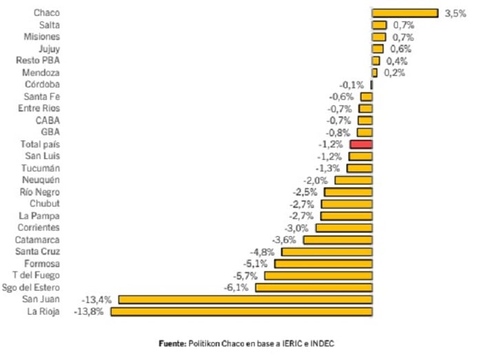 No obstante, durante la última etapa la provincia de Misiones demostró números positivos para el empleo registrado. De esta manera, se ubica junto a Chaco y Salta en el top 3 de provincias en desarrollo positivo, mientras que Jujuy está apenas por debajo. Así se observa en el gráfico siguiente: