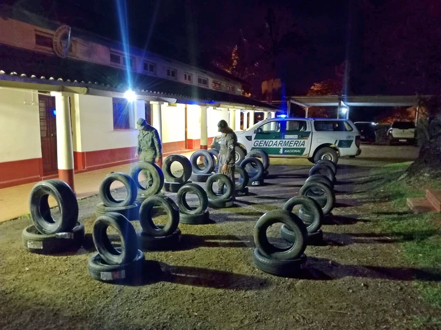 Al arribar al lugar, los gendarmes procedieron a rastrillas las inmediaciones, resultando en el hallazgo de 38 neumáticos de origen extranjero, de distintos rodados y medidas los cuales carecían de cualquier tipo de aval.