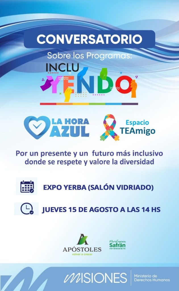 La Secretaría de Desarrollo Social de la Municipalidad de la ciudad misionera de Apóstoles se complace en invitar a la comunidad a un conversatorio sobre los programas "La Hora Azul" y "Espacio TEAmigo", con el objetivo de promover un presente más inclusivo donde se respete y valore la diversidad.