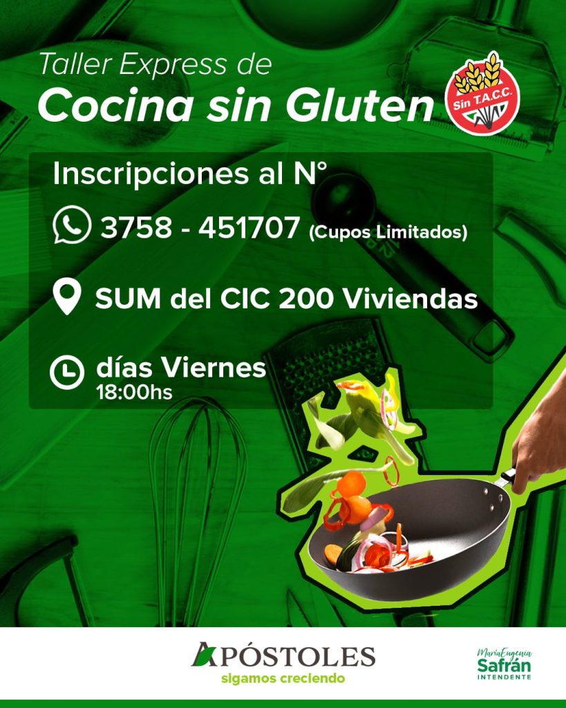 La Secretaría de Desarrollo Social de la Municipalidad de la ciudad misionera de Apóstoles anuncia la realización de un taller de cocina sin gluten, dirigido a personas interesadas en aprender a preparar recetas libres de gluten.