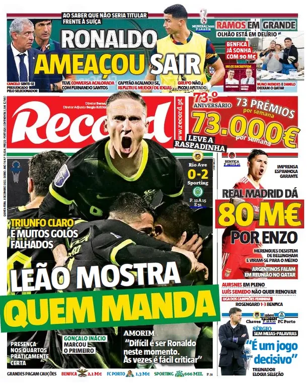 En ese contexto, la portada de Récord tituló "Ronaldo amenazó con irse" al enterarse de que el entrenador Fernando Santos había decidido no incluirlo como titular ante Suiza, en la goleada que los portugueses le propinaron por 6-1 en los octavos de final el martes pasado.