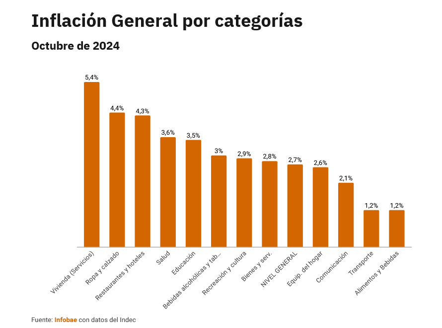 El ítem de mayor aumento en el mes fue el de “vivienda, agua, electricidad, gas y otros combustibles” (5,4%), donde están comprendidas las tarifas de los servicios públicos. Le siguieron en orden descendente “prendas de vestir y calzado” (4,4%), “restaurantes y hoteles” (4,3%), salud (3,6%) y educación (3,5%), entre otros.