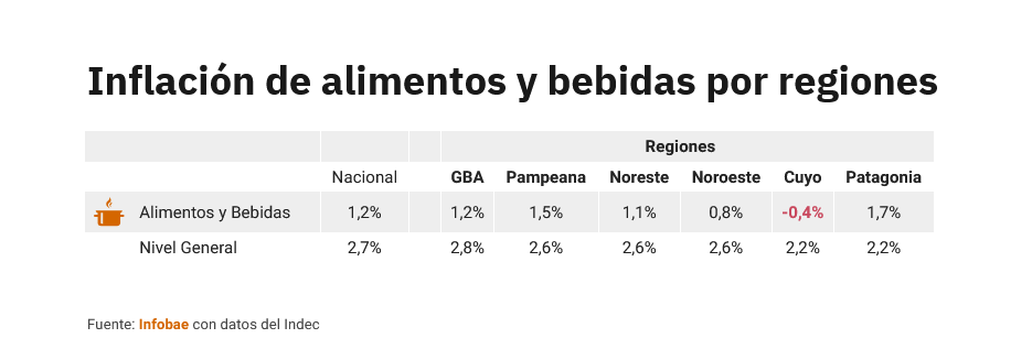 Por ahora, Cuyo es la única región del país que muestra deflación en algún rubro del Índice de Precios al Consumidor. Según el INDEC, el ítem de “alimentos y bebidas no alcohólicas” presentó una variación de 1,2% en el Gran Buenos Aires (GBA), de 1,5% en la región Pampeana, de 1,1% en el Noreste, de 0,8% en el Noroeste y de 1,7% en la Patagonia.