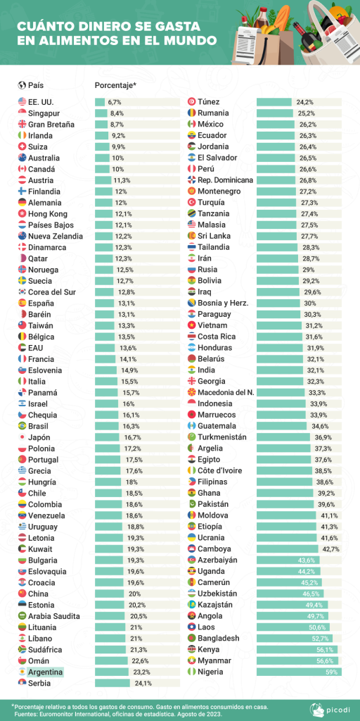 Argentina ocupa en este ranking el puesto 52. entre 105 países – los alimentos y bebidas no alcohólicas suponen el 23,2% del gasto de consumo. Este resultado es similar al de Omán (22,6%), Serbia (24,1%) y Tunisia (24,2%).