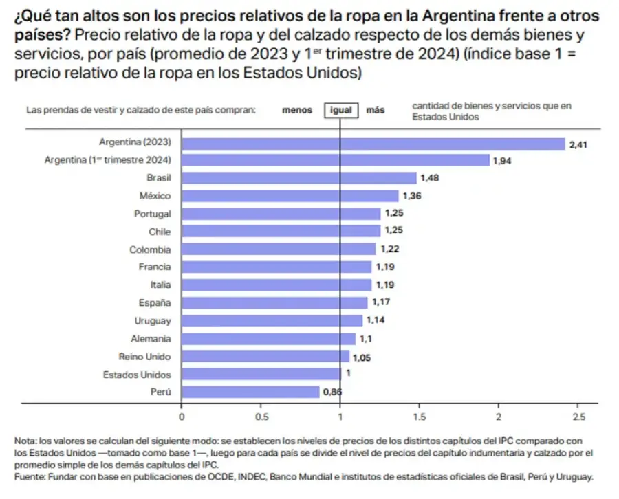 A raíz del incremento en el precio relativo de la indumentaria, Fundar remarcó también que hoy una prenda de vestir en Argentina compra un 94% más de bienes y servicios respecto de lo que adquiere una prenda en Estados Unidos. En otras palabras: una persona que decide ahorrarse el gasto en vestimenta en Argentina puede adquirir casi el doble de bienes y servicios, que una persona que decide no comprar ropa en el país norteamericano.