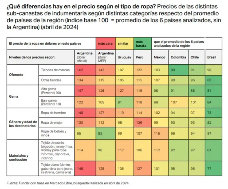 En efecto, los precios locales son relativamente más caros en tejidos planos, indumentaria de alta gama y productos de marca, llegando en este último caso a ser un 62% más elevados que en la región.