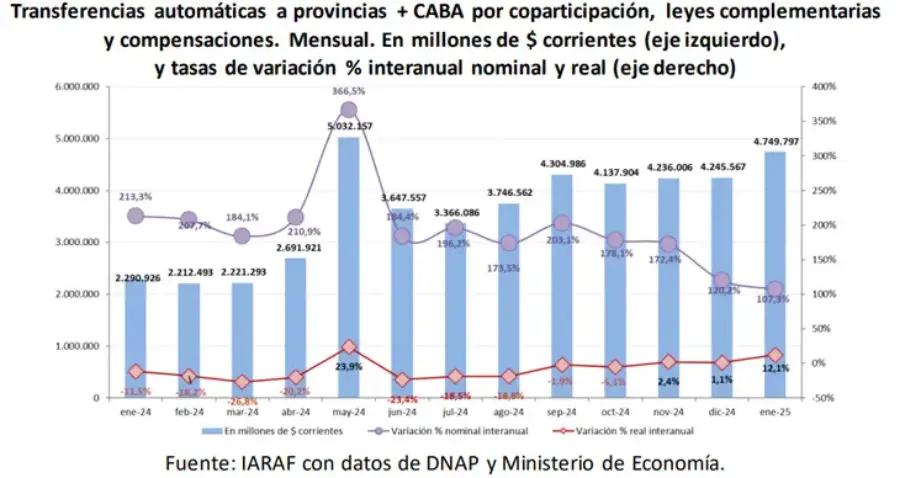 Según el IARAF “en el mes de enero de 2025, el Gobierno Nacional envió al consolidado de provincias más Ciudad Autónoma de Buenos Aires 4.749 billones de pesos en concepto de coparticipación, leyes especiales y compensaciones”. “Esto implicaría una suba real del 12%. Por su parte, la coparticipación neta, es decir las transferencias automáticas menos leyes complementarias y compensaciones, habría crecido un 9,5% real”, dice el reporte.