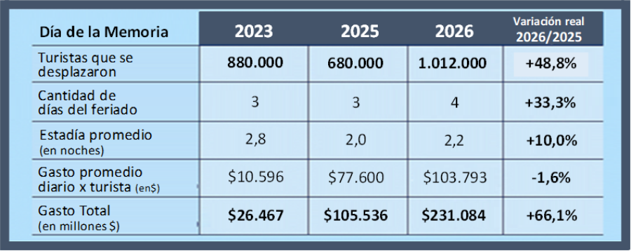 - El gasto promedio diario fue de 103.793 pesos, un 7% menor al gasto del feriado de Carnaval de Febrero último. Esto se explica a partir de que los turistas eligieron destinos más cercanos y también porque entre los gastos recreativos no existió la oferta del Carnaval. En cambio, prevalecieron actividades culturales y conmemorativas por el 24 de Marzo, casi todas de acceso gratuito. También fue un 1,6% menor al feriado de la Memoria del año pasado, comparado a precios reales.