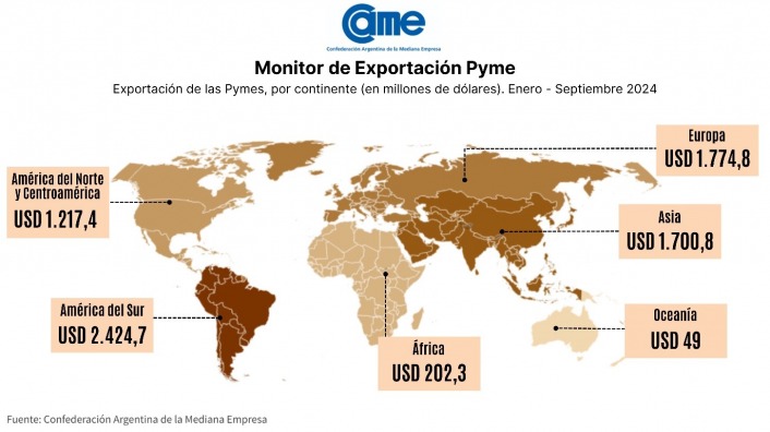 Así surge del Monitor de Exportación PyME (MEP), un indicador elaborado por el sector de Estadísticas e Informes de la Confederación Argentina de la Mediana Empresa (CAME), para medir las exportaciones de las pequeñas y medianas empresas de la República Argentina, en base al monitoreo mensual de las operaciones de las empresas argentinas en el comercio exterior. Se discrimina por su condición PyME declarada ante la Secretaría de la Pequeña y Mediana Empresa, Emprendedores y Economía del Conocimiento, dependiente del Ministerio de Economía de la Nación.