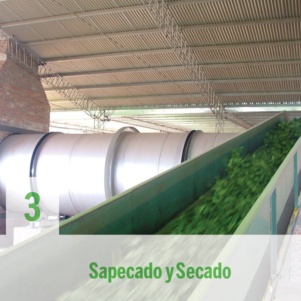 En estos procesos se somete unos segundos (sapeco) la hoja verde al calor para reducir al mínimo el porcentaje de humedad y lograr hojas crujientes. Las hojas son transportadas en cintas para continuar secándolas.