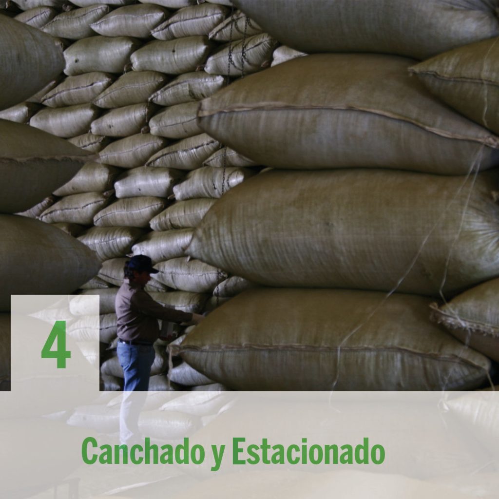 Se realiza una primera molienda gruesa o “canchado” de la hoja ya seca. Luego se coloca la yerba canchada en bolsas y se la estaciona