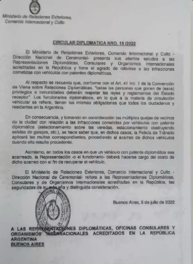 Esto significa que "los funcionarios diplomáticos, en lo que a materia de circulación se refiere, tienen las mismas obligaciones que todos los ciudadanos y residentes en la Argentina", según reza la circular enviada el 5 de Julio de 2022.