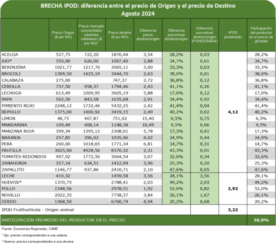 Los precios de los agroalimentos se multiplicaron por 3,2 veces del campo (origen) a la góndola (destino) en Agosto. Es decir, el consumidor pagó 3,2 pesos por cada peso que recibió el productor, según el Indicador de Precios en Origen y Destino (IPOD) elaborado por el sector de Economías Regionales de la Confederación Argentina de la Mediana Empresa (CAME).