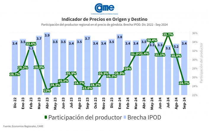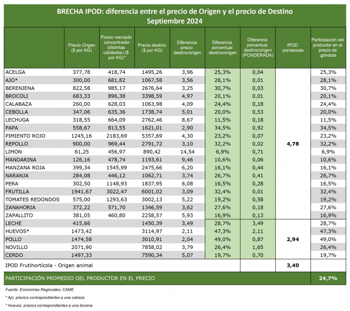 Según el Indicador de Precios en Origen y Destino (IPOD) elaborado por el sector de Economías Regionales de la Confederación Argentina de la Mediana Empresa (CAME), en el mes de Septiembre los precios de los agroalimentos se multiplicaron por 3,4 veces del campo (origen) a la góndola (destino). Es decir, el consumidor pagó 3,4 pesos por cada 1 peso que recibió el productor.