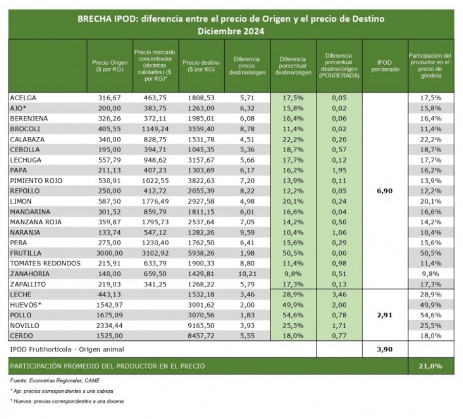 Según el Indicador de Precios en Origen y Destino (IPOD) elaborado por el sector de Economías Regionales de la Confederación Argentina de la Mediana Empresa (CAME), en diciembre los precios de los agroalimentos se multiplicaron por 3,9 veces del campo (origen) a la góndola (destino). Es decir, el consumidor pagó 3,9 pesos por cada 1 peso que recibió el productor.