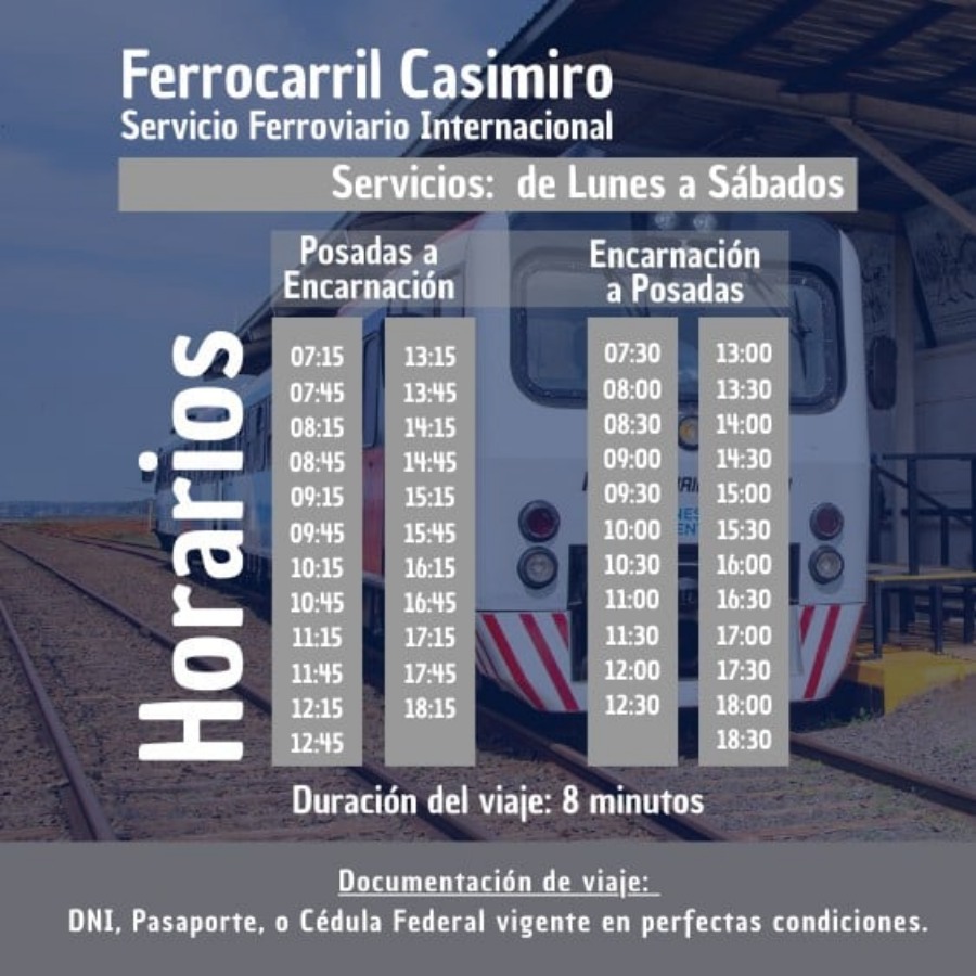 En tanto, desde Encarnación con destino a Posadas, el primer tren parte a las 07:30 con intervalos de media hora. El último servicio es a las 18:30 horas.