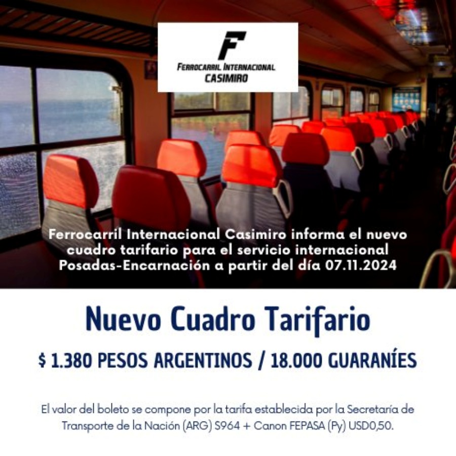 “A partir del próximo jueves, 7 de Noviembre, entrará en vigencia el nuevo cuadro tarifario del servicio internacional de ferrocarril“, anunció desde la Empresa Ferrocarril Internacional Casimiro, en sus redes sociales.